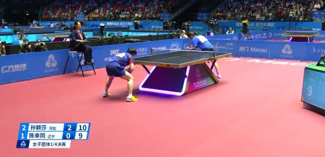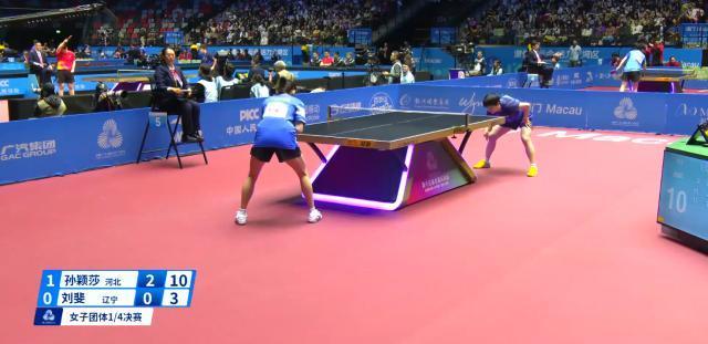 第二场女单对决,河北队派出孙颖莎出战,辽宁队则派出刘斐出战。有意思的是,两名选手在此前单打项目就有过交手。在11月13日晚上进行的女单1/4决赛中,孙颖莎直落四局战胜了刘斐,闯入4强。时隔5天之后,两人又在团体项目中再次相遇,这一次笑到最后的还是莎莎。最终,孙颖莎直落三局再次取得一场完胜,三局比分分别为11比4、11比3、11比3。本场获胜后,孙颖莎帮助河北队将大比分扩大为2比0。 第三场女单比赛,由王添艺对阵王艺迪。前4局比赛,两人各赢2局,比赛进入决胜局。最终,王艺迪技高一筹在决胜局中笑到最后,五局比分分别为5比11、11比6、10比12、11比9、11比4。王艺迪也帮助辽宁队拿到了本场比赛的第1分。