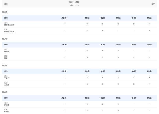 本场比赛,孙颖莎出战两场女单比赛,她先后战胜了刘斐和陈幸同,帮助河北队在这场胜利中拿到关键的2分。值得一提的是,河北队将在女团半决赛中对阵王曼昱领衔的黑龙江队。 河北队阵中拥有孙颖莎、何卓佳和王添艺;而辽宁队则由陈幸同、王艺迪和刘斐领衔。 首场女双比赛,河北队派出何卓佳/王添艺出战,辽宁队则派出陈幸同/王艺迪出战。此役何卓佳/王添艺率先拿下第一局,不过陈幸同/王艺迪连赢两局反超比分,接着何卓佳/王添艺同样连赢两局还以颜色,从而以3比2的比分获胜,为河北队率先拿到本场比赛的地1分,五局比分分别为11比7、8比11、10比12、11比2、11比3。
